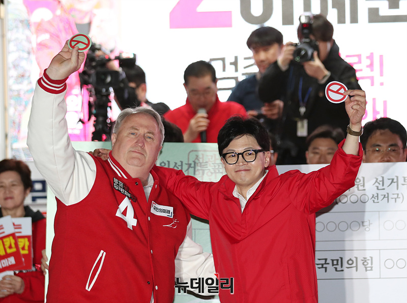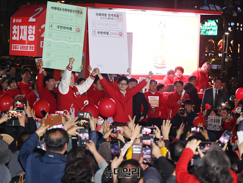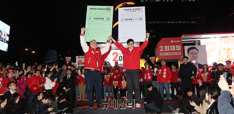 한동훈 국민의힘 총괄선대위원장과 인요한 국민의미래 선대위원장이 9일 오후 서울 중구 청계광장에서 열린 '국민의힘으로 대한민국 살리기' 제22대 총선 파이널 총력유세에서 투표 독려 퍼포먼스를 하고 있다.