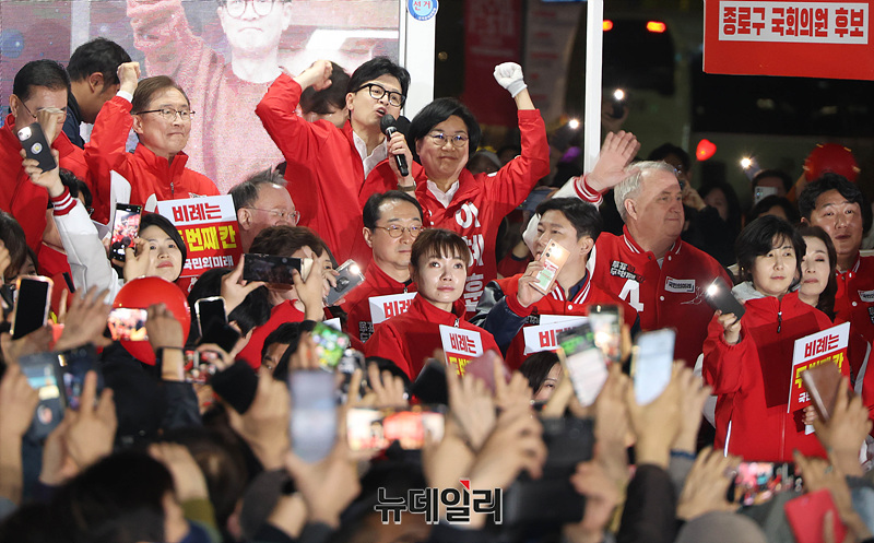한동훈 국민의힘 총괄선대위원장, 인요한 국민의미래 선대위원장이 9일 오후 서울 중구 청계광장에서 열린 '국민의힘으로 대한민국 살리기' 제22대 총선 파이널 총력유세에서 지지를 호소하고 있다.