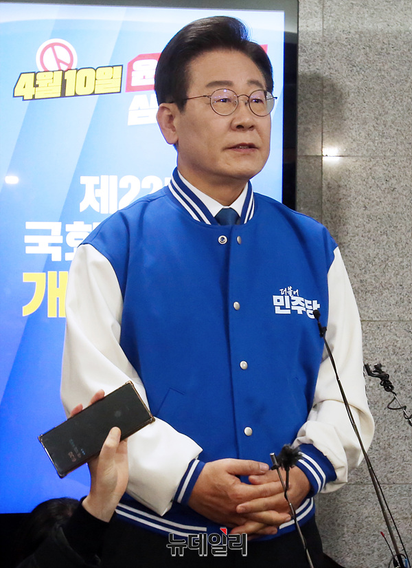 이재명 더불어민주당 대표와 당 지도부가 10일 오후 서울 여의도 국회의원회관 대회의실에 마련된 제22대 국회의원 선거 개표상황실을 나서며 입장을 밝히고 있다.