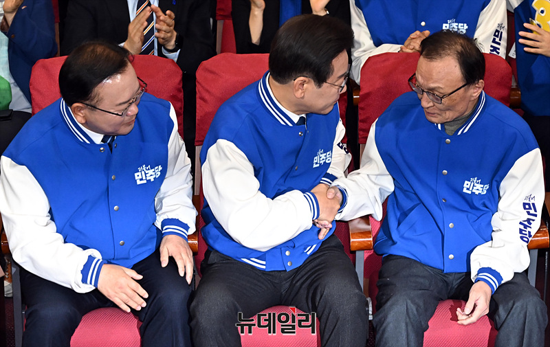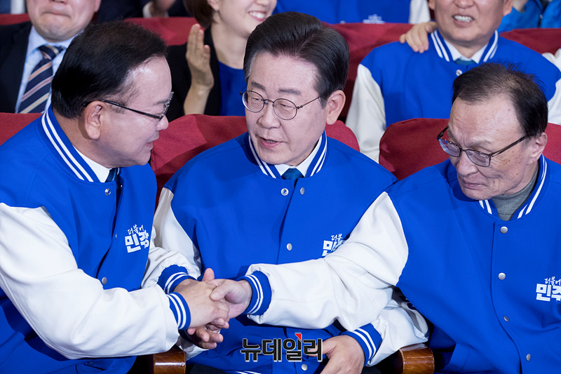 이재명 더불어민주당 대표, 이해찬·김부겸 상임공동선대위원장이 10일 오후 서울 여의도 국회의원회관 대회의실에 마련된 제22대 국회의원 선거 개표상황실에서 인사를 나누고 있다.