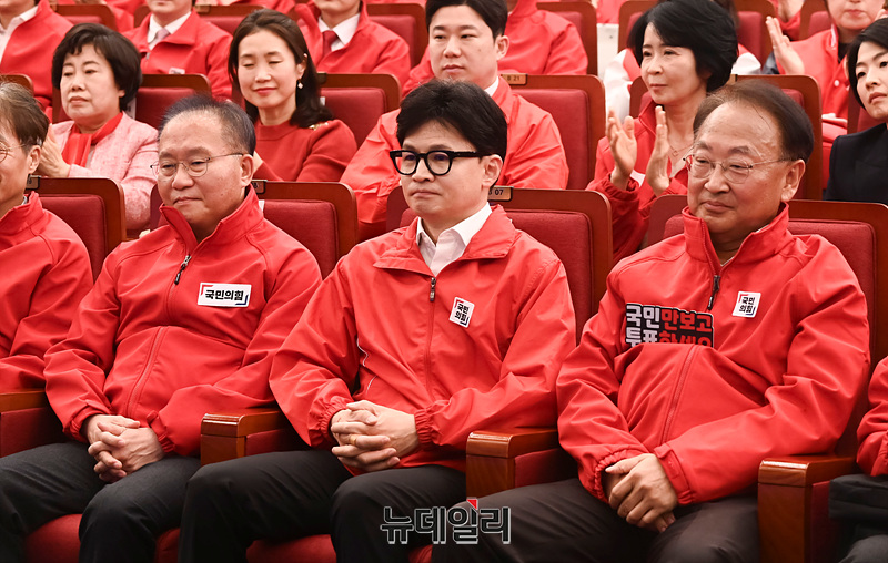 한동훈 국민의힘 총괄선대위원장과 윤재옥 공동선대위원장을 포함한 당 지도부가 10일 오후 서울 국회도서관 강당에 마련된 제22대 국회의원선거 개표상황실에서 출구조사 결과발표 방송을 지켜보고 있다.