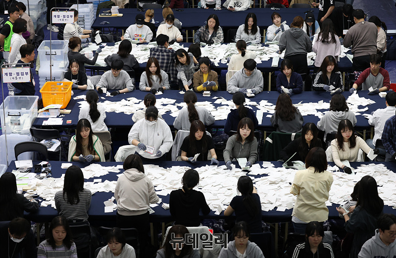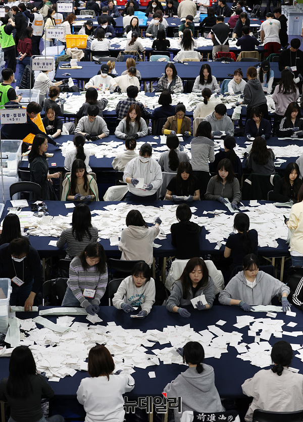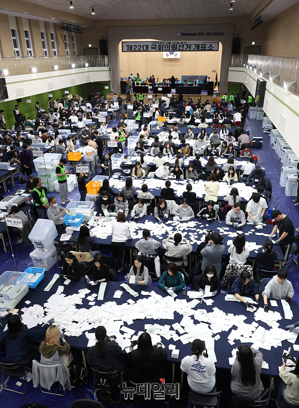 제22대 국회의원 선거 개표가 시작된 10일 오후 서울 용산구 신광여자고등학교에 마련된 개표소에서 사무원들이 투표지 분류 작업을 하고 있다.