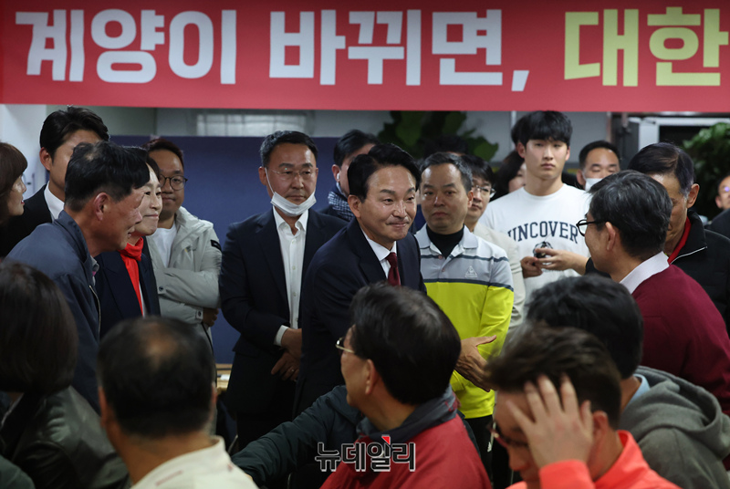 원희룡 국민의힘 인천 계양을 후보 내외와 이천수 후원회장이 개표가 시작된 10일 오후 9시 50분께 계양구 본인의 선거사무소에 마련된 상황실을 방문해 지지자와 인사를 나누고 있다. (인천=정상윤 기자)