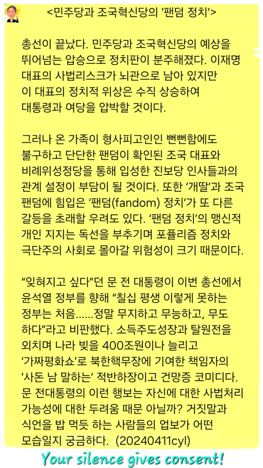 또한 [개딸] 과 조국 팬덤에 힘입은 [팬덤(fandom) 정치] 가 또 다른 갈등을 초래할 우려도 있다.[팬덤 정치] 의 맹신적 개인 지지는 독선을 부추기며 포퓰리즘 정치와 극단주의 사회로 몰아갈 위험성이 크기 때문이다.“잊혀지고 싶다” 던 문재인 전 대통령이 이번 총선에서 윤석열 정부를 향해 “칠십 평생 이렇게 못하는 정부는 처음 … 정말 무지하고 무능하고, 무도하다” 라고 비판했다.소득주도성장과 탈원전을 외치며 나라 빚을 400조원이나 늘리고 [가짜평화쇼] 로 북한핵무장에 기여한 책임자의 [사돈 남 말하는] 적반하장이고 건망증 코미디다.문 전대통령의 이런 행보는 자신에 대한 사법처리 가능성에 대한 두려움 때문 아닐까?거짓말과 식언을 밥 먹듯 하는 사람들의 업보가 어떤 모습일지 궁금하다.