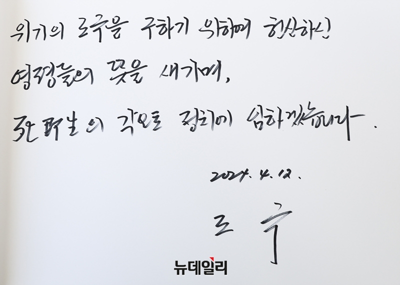 조국 조국혁신당 대표와 제22대 총선 당선인들이 12일 오전 서울 동작구 국립서울현충원을 찾아 참배에 앞서 방명록을 작성하고 있다.