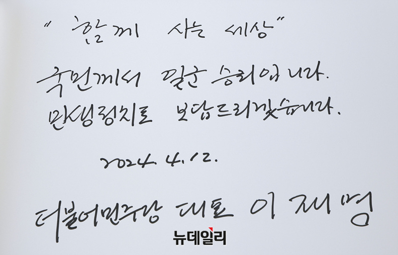 이날 이 대표는 방명록에 "함께 사는 세상 국민께서 일군 승리입니다. 민생정치로 보답드리겠습니다"라고 적었다.