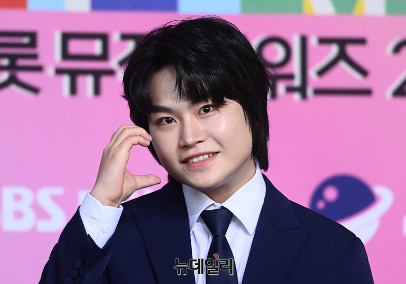 가수 황민우가 12일 오후 서울 마포구 SBS 프리즘타워에서 열린 '트롯뮤직어워즈 2024' 레드카펫에서 포즈를 취하고 있다.
