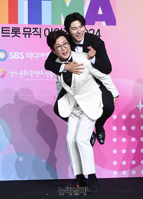 방송인 김성주와 이이경이 12일 오후 서울 마포구 SBS 프리즘타워에서 열린 '트롯뮤직어워즈 2024' 레드카펫에서 포즈를 취하고 있다.