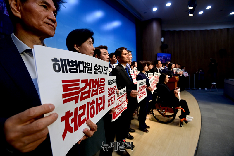 박주민 더불어민주당 원내수석부대표 겸 해병대원 사망사건 진상규명 TF 단장 및 의원·당선인 들이 15일 오전 국회 소통관에서 '채상병 특검법' 관련 기자회견을 갖고 윤석열 대통령의 '채상병 특검법' 즉각 수용을 촉구하고 있다.