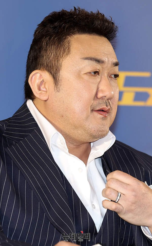 배우 마동석이 15일 오후 서울 강남구 메가박스 코엑스에서 열린 영화 '범죄도시4(감독 허명행)' 언론시사회에서 질문에 답하고 있다. 마동석은 오는 5월 결혼을 앞두고 있다. 4월 24일 극장개봉.