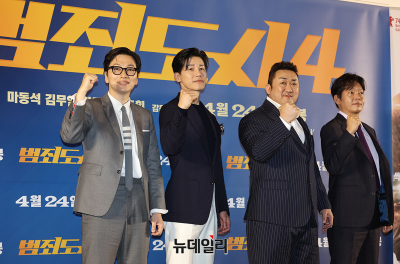 '범죄도시4'는 괴물 형사 마석도가 대규모 온라인 불법 도박 조직을 움직이는 특수부대 용병 출신의 빌런 백창기와 IT 업계 천재 CEO 장동철에 맞서 다시 돌아온 장이수, 광수대&사이버팀과 함께 펼치는 범죄 소탕 작전을 그린다. 24일 극장 개봉.