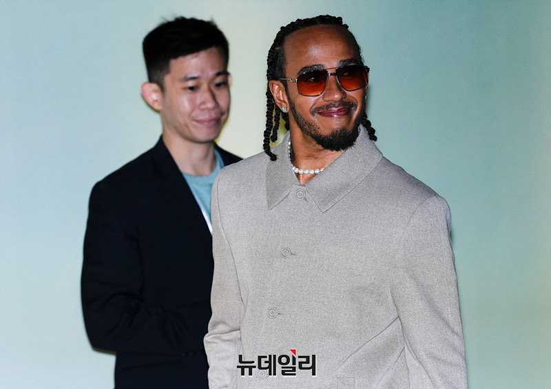 메르세데스-AMG 페트로나스 F1팀 소속 레이서 루이스 해밀턴이 15일 오후 서울 성동구 에스팩토리에서 열린 프리미엄 모빌리티 브랜드 리모와의 '새로운 시즈널 컬러, 민트&파파야 컬렉션' 첫 공개 기념 포토월에서 포즈를 취하고 있다.