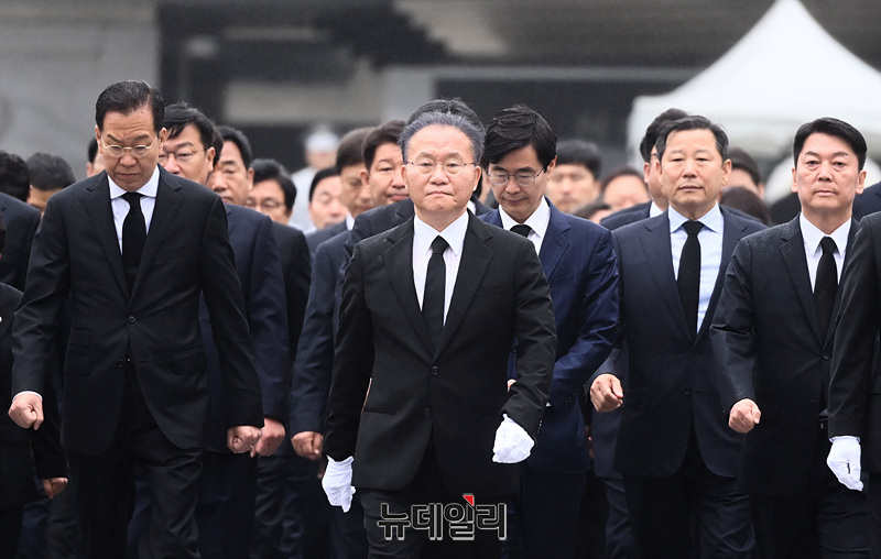 윤재옥 국민의힘 원내대표 겸 당 대표 권한대행이 16일 오전 서울 동작구 국립서울현충원에서 국민의힘·국민의미래 국회의원 당선인들과 함께 참배를 마친 뒤 이동하고 있다.
