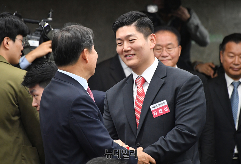 김재섭 국민의힘 당선인이 16일 오전 국회에서 열린 제22대 국회 국민의힘·국민의미래 당선자총회에 참석해 인사를 나누고 있다.