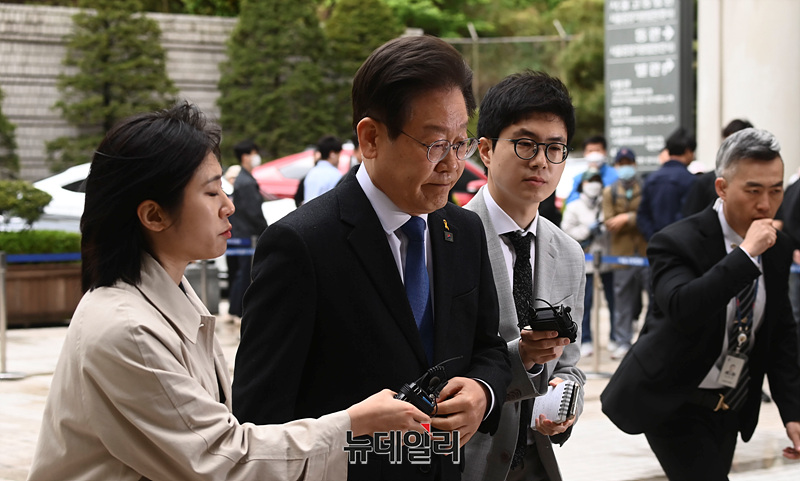 이재명 더불어민주당 대표가 16일 오전 서울 서초구 중앙지법에서 열린 대장동·성남FC·백현동 관련 배임·뇌물 등 혐의 재판에 출석하고 있다.