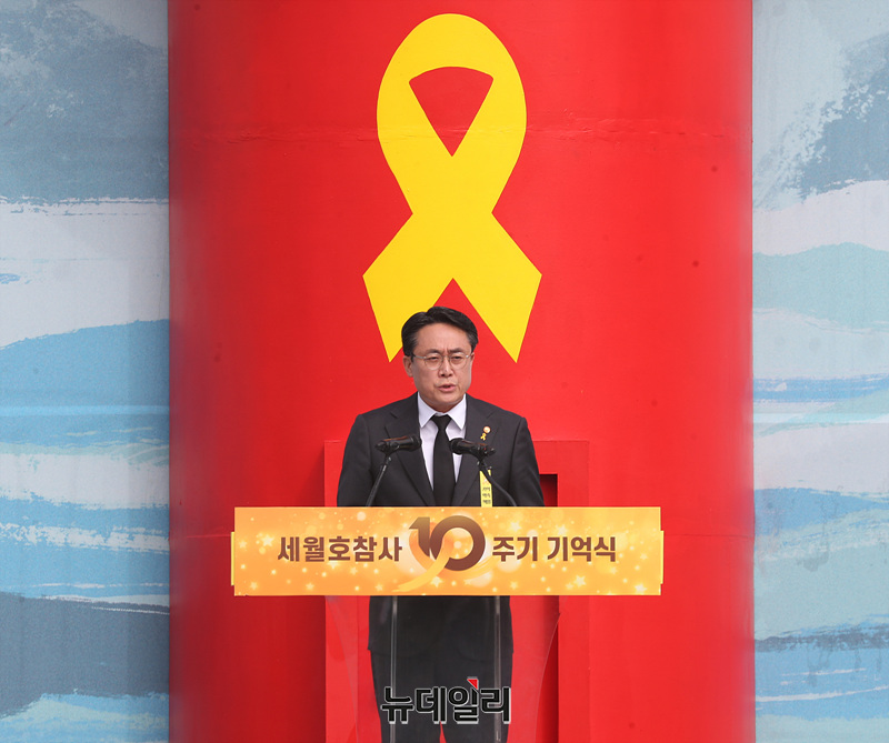 강도형 해양수산부 장관이 16일 오후 경기 안산시 화랑유원지에서 열린 세월호참사 10주기 기억식에서 추도사를 하고 있다. (경기 안산=서성진 기자)