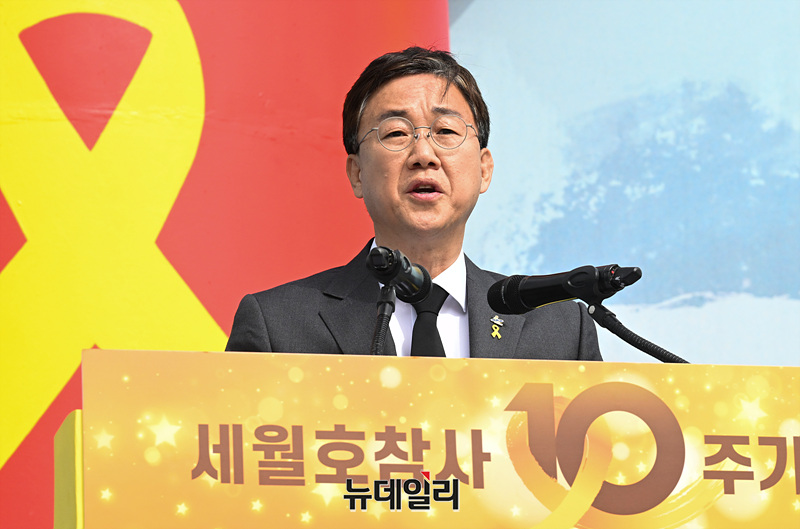 이민근 안산시장이 16일 오후 경기 안산시 화랑유원지에서 열린 세월호참사 10주기 기억식에서 추도사를 하고 있다. (경기 안산=서성진 기자)