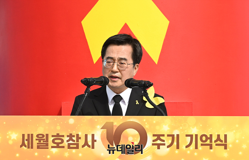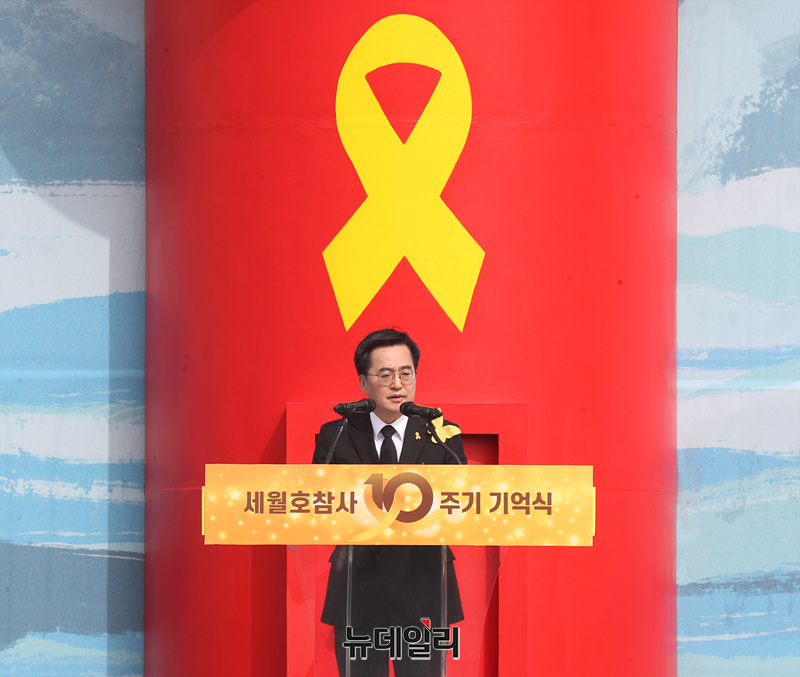 김동연 경기도지사가 16일 오후 경기 안산시 화랑유원지에서 열린 세월호참사 10주기 기억식에서 추도사를 하고 있다. (경기 안산=서성진 기자)