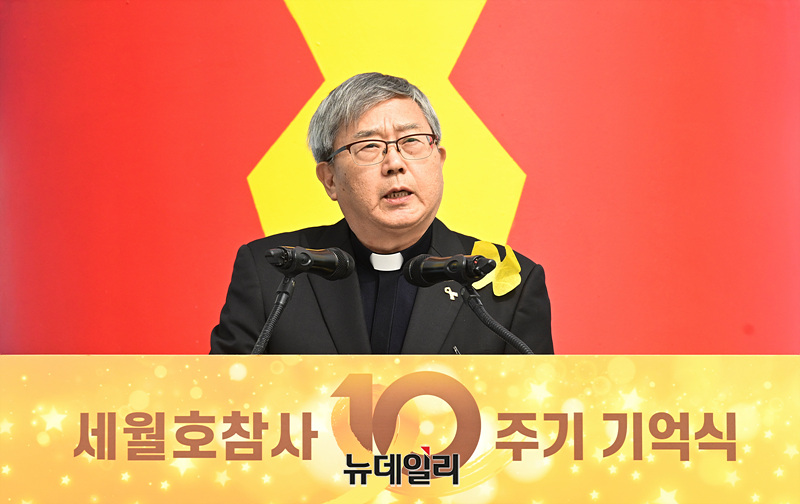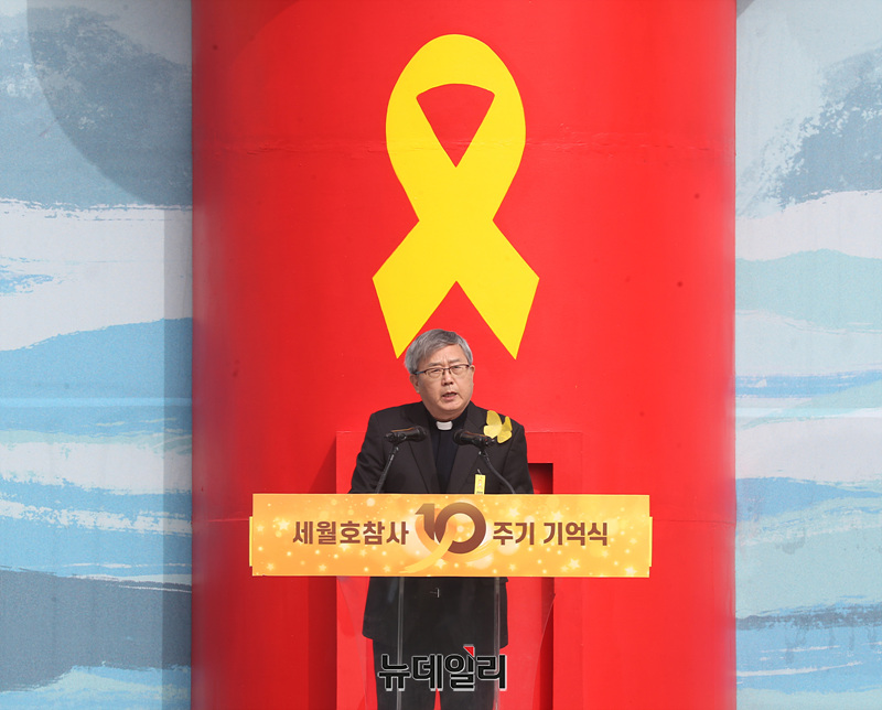 김광준 4·16재단 이사장이 16일 오후 경기 안산시 화랑유원지에서 열린 세월호참사 10주기 기억식에서 추도사를 하고 있다. (경기 안산=서성진 기자)