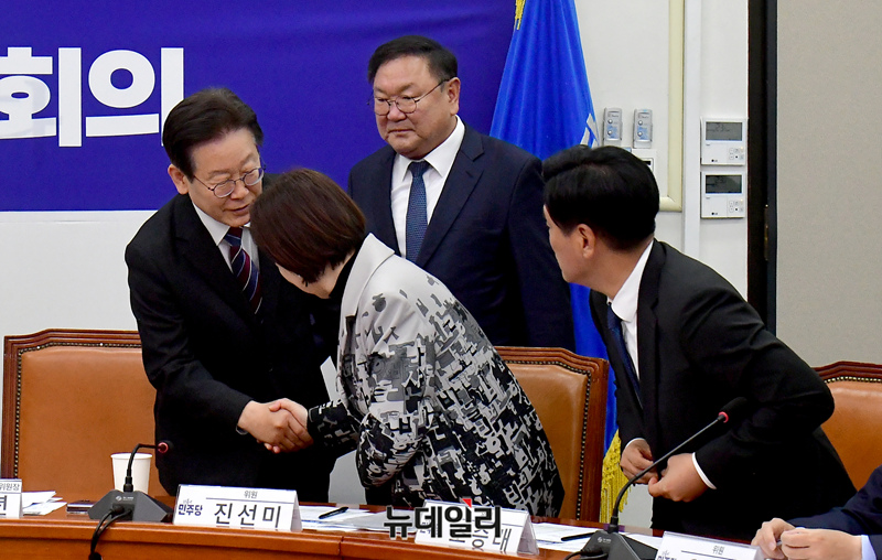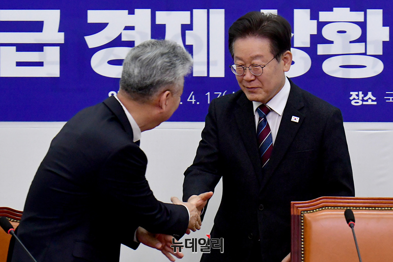 이재명 더불어민주당 대표가 17일 국회에서 열린 긴급 경제상황점검회의에 참석하며 인사를 나누고 있다.