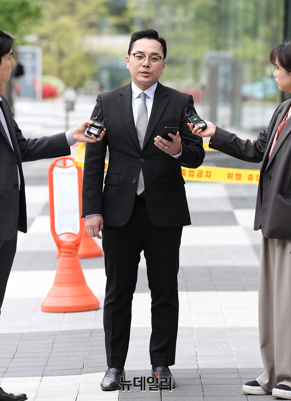 '공직선거법 위반' 혐의로 기소된 이재명 더불어민주당 대표의 배우자 김혜경 씨 사건의 공익제보자 조명현 씨가 22일 오전 수원지방법원에서 열린 공판에 출석해 입장을 밝히고 있다.(경기 수원=정상윤 기자)