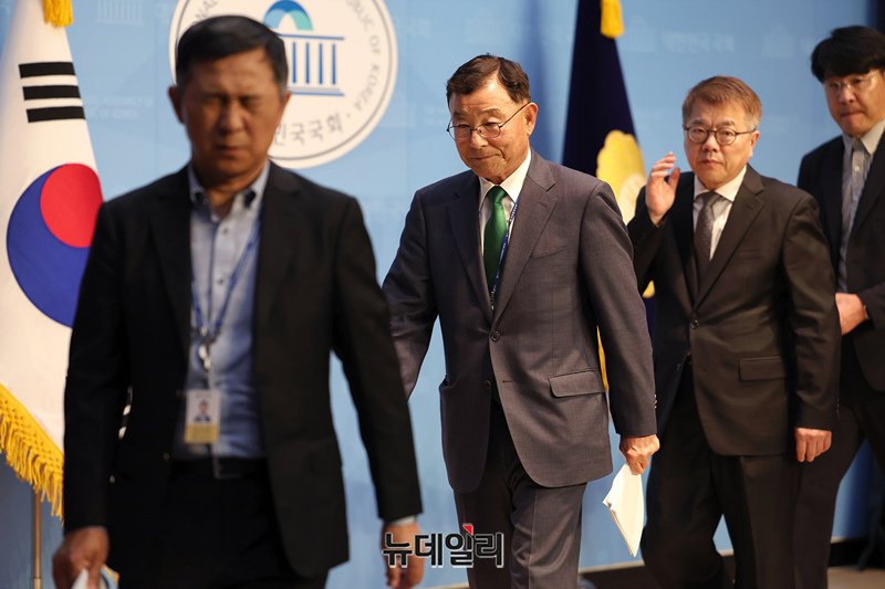 김상균 국회 연금개혁특별위원회 공론화위원회 위원장이 22일 오후 국회소통관에서 공론화위원회 숙의토론회 주요 결과 및 시민대표단 설문조사 결과를 발표를 마치고 이동하고 있다.