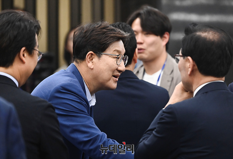 권성동 국민의힘 의원이 22일 오후 국회에서 열린 제22대 국회의원 당선자 총회에서 인사를 나누고 있다.