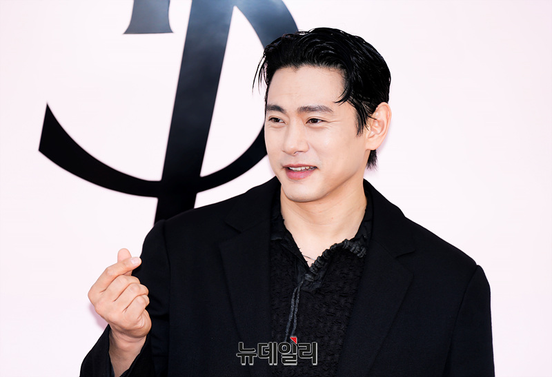 배우 유태오가 24일 오후 서울 성동구 엠프티에서 열린 '입생로랑 뷰티 러브샤인 팩토리 팝업 이벤트' 포토월에서 포즈를 취하고 있다.