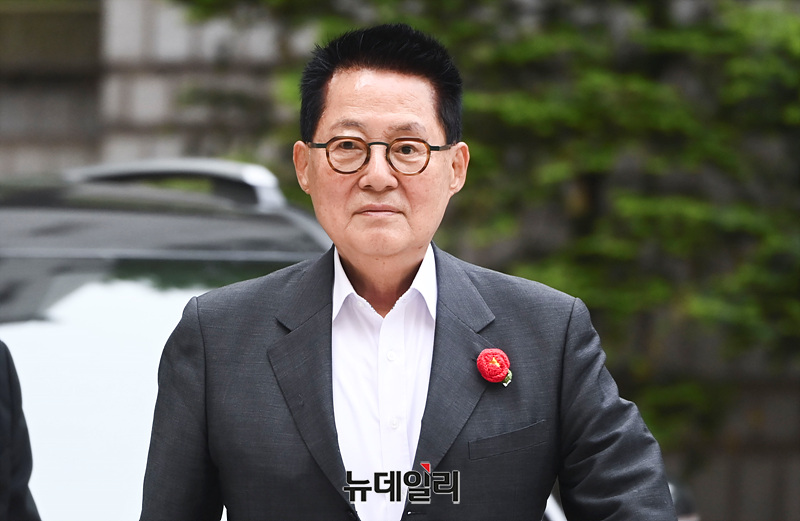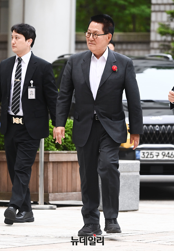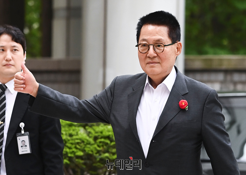 제22대 국회의원 총선거에서 더불어민주당 소속으로 전남 해남·완도·진도에 당선된 박지원 전 국정원장이 26일 서울 서초구 중앙지법에서 열린 '서해 공무원 피살 사건' 관련 속행공판에 출석하고 있다.