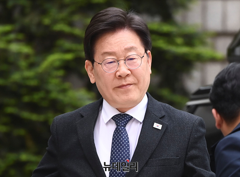 이재명 더불어민주당 대표가 26일 오전 서울 서초구 중앙지법에서 열린 '대장동·성남FC 배임·뇌물 등 혐의' 관련 공판에 출석하고 있다.
