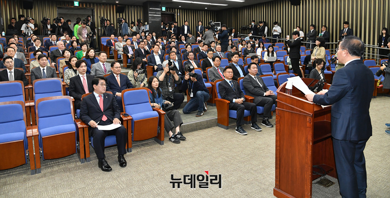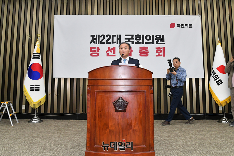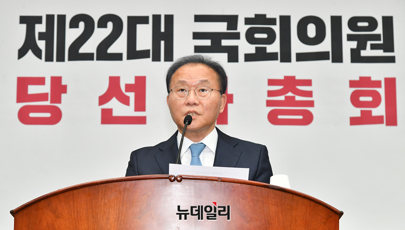 윤재옥 국민의힘 당 대표 권한대행이 29일 국회에서 열린 제22대 국회의원 당선자 총회에서 모두발언을 하고 있다.