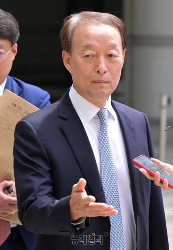 '문재인 정권 블랙리스트' 의혹과 관련해 백운규 전 산업통상자원부 장관이 29일 오후 서울 서초구 중앙지법에서 열린 첫 공판에 출석하고 있다. 백 전 장관은 이전 정부에서 임명된 공공기관장들에게 정당한 사유 없이 사직서를 작성하게 했다는 혐의를 받고 있다.