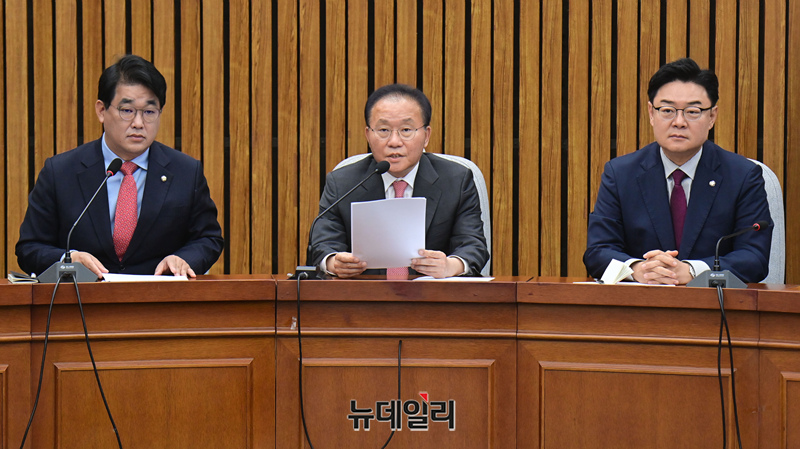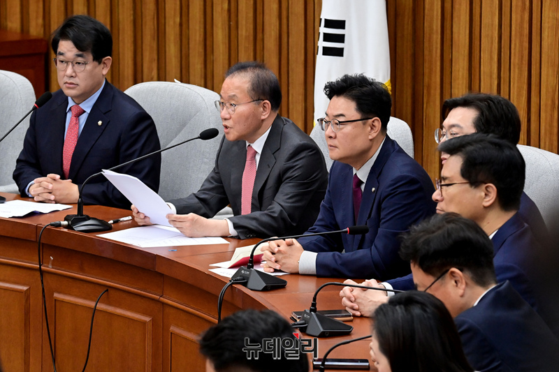 윤재옥 국민의힘 원내대표 겸 당 대표 권한대행이 30일 오전 국회에서 열린 원내대책회의에서 모두발언을 하고 있다.