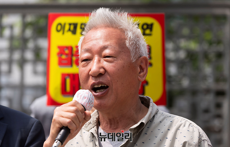 류석춘 전 연세대 교수가 1일 오전 서울 서초구 대검찰청 앞에서 열린 '정치권력 눈치재판 사법부 규탄 기자회견'에서 발언하고 있다.