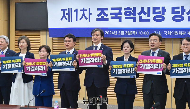 조국혁신당 국회의원 당선인 제1차 총회가 2일 오전 국회 의원회관에서 열린 가운데 조국 대표와 당선인들이 '채해병 특검법 가결하라', '전세사기특별법 가결하라' 피켓을 들고 구호를 외치고 있다.