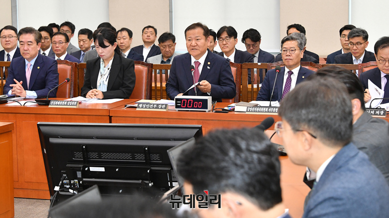 이상민 행정안전부 장관이 2일 오전 국회에서 열린 행정안전위원회 전체회의에서 의원들의 질문에 답하고 있다.