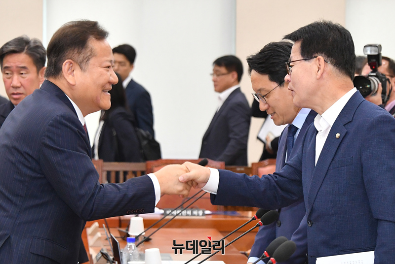 [포토] 민주당 의원들과 악수 나누는 이상민 행정안전부 장관