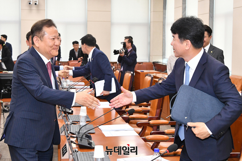 이상민 행정안전부 장관이 2일 오전 국회에서 열린 행정안전위원회 전체회의에서 10·29이태원참사 피해자 권리보장과 진상규명 및 재발방지를 위한 특별법이 의결되고 더불어민주당 의원들과 인사를 하고 있다.
