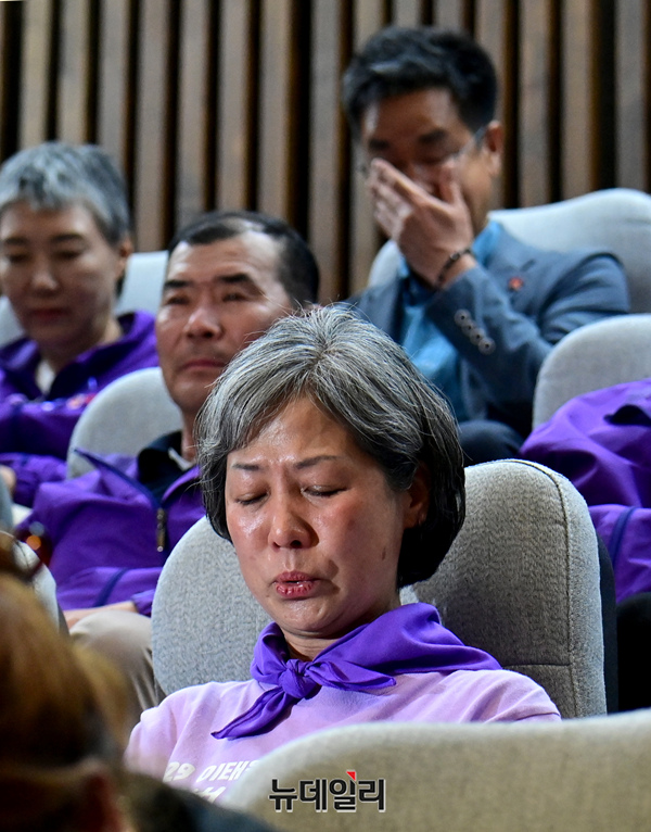 이태원참사 유족들이 2일 오후 국회 본회의장에서 여야 합의로 '이태원 참사 진상규명 특별법'이 통과되자 눈물을 흘리고 있다.