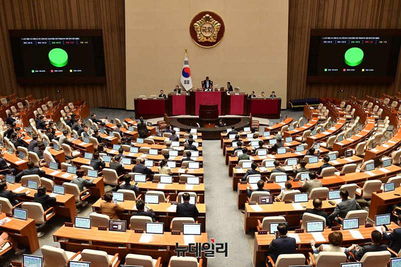 순직 해병 수사 방해 및 사건 은폐 등의 진상규명을 위한 특별검사의 임명 등에 관한 법률안이 2일 오후 국회에서 열린 본회의에서 국민의힘 의원들이 퇴장한 가운데 가결되고 있다.