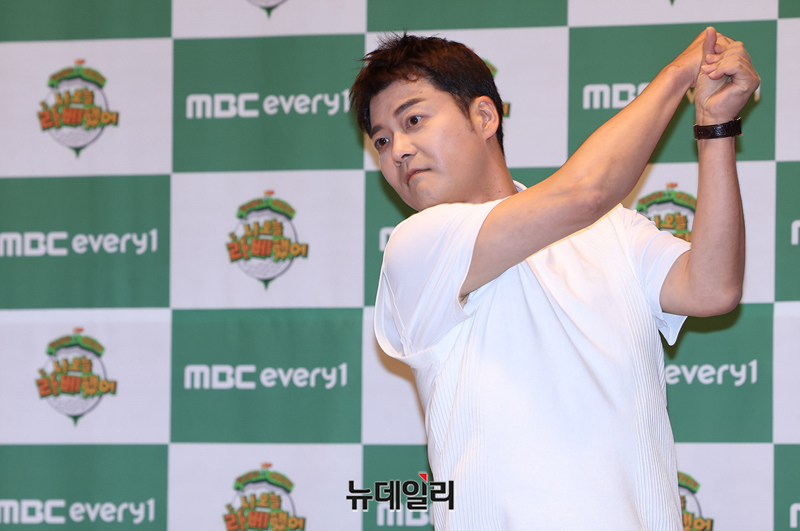방송인 전현무가 7일 오전 서울 중구 앰버서더 서울 풀만에서 열린 MBC에브리원 골프 리얼리티 예능 '나 오늘 라베했어(연출 이세영)' 제작보고회에서 포토타임을 갖고 있다.