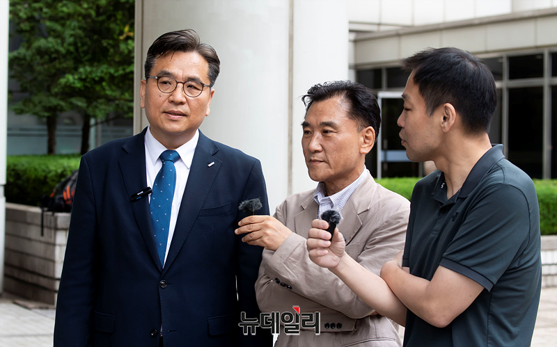 20대 대통령 선거를 앞두고 김건희 여사 '쥴리 의혹'을 제기한 정천수 전 열린공감TV 대표가 7일 오전 서울 서초구 중앙지법에서 열린 공직선거법 위반 공판에 앞서 입장을 밝히고 있다.