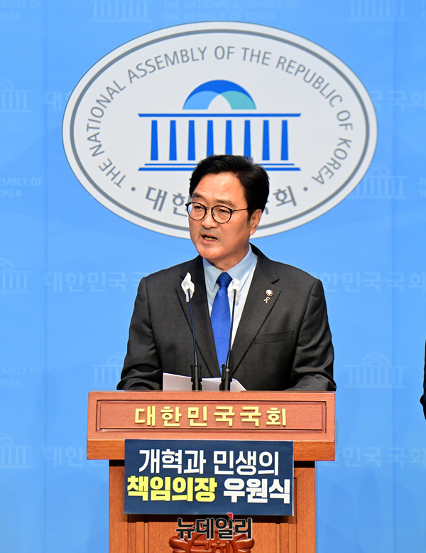 우원식 더불어민주당 의원이 7일 오전 국회 소통관에서 국회의장 출마 기자회견을 하고 있다.