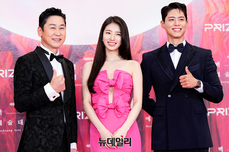 방송인 신동엽과 배우 수지, 박보검이 7일 오후 서울 강남구 코엑스에서 열린 '제60회 백상예술대상' 레드카펫 행사에서 포즈를 취하고 있다.