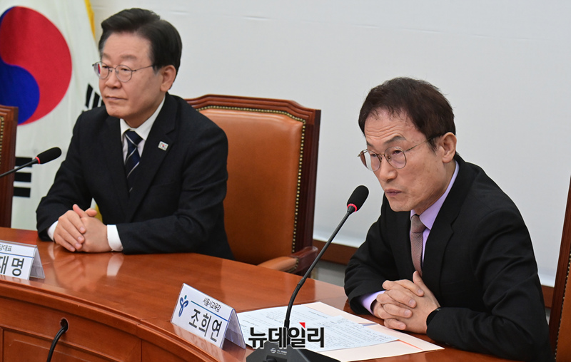 [포토] 민주당 찾아 발언하는 조희연 서울시교육감