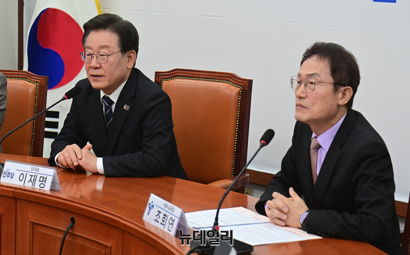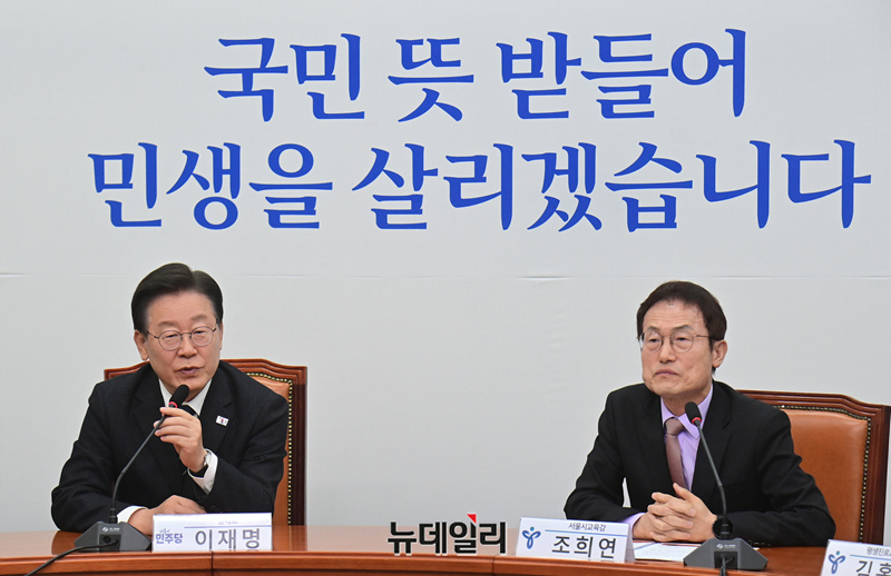 이재명 더불어민주당 대표가 8일 오후 국회에서 조희연 서울시교육감을 접견해 모두발언을 하고 있다.