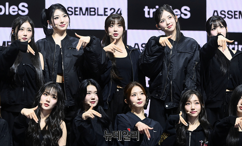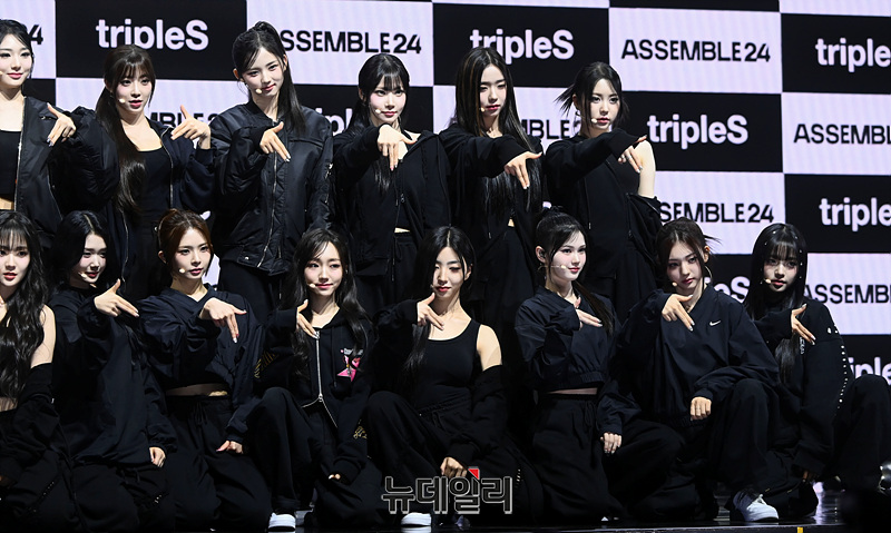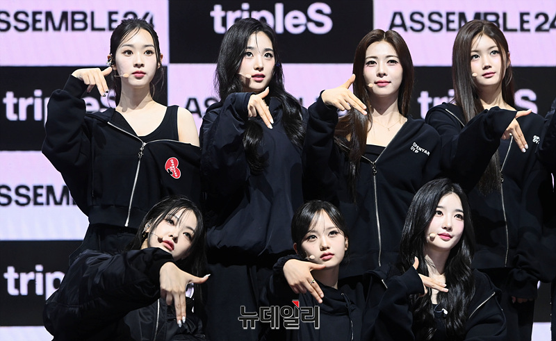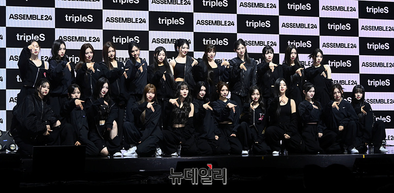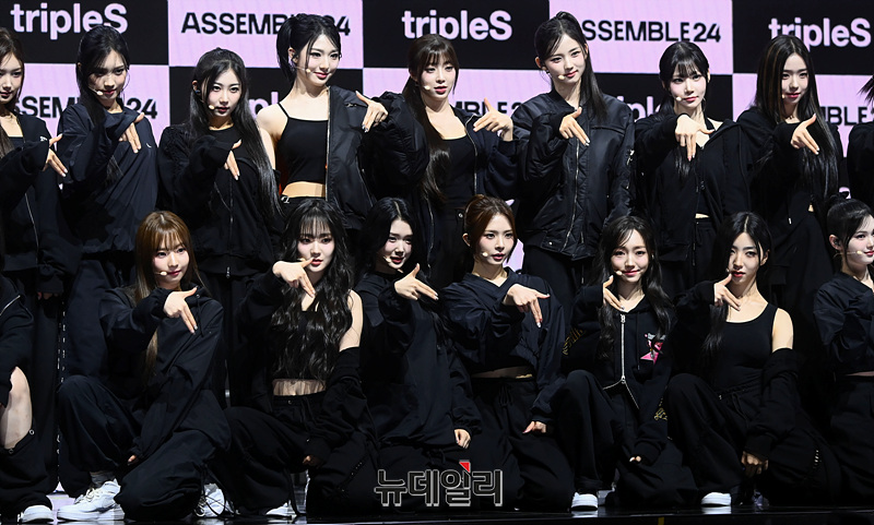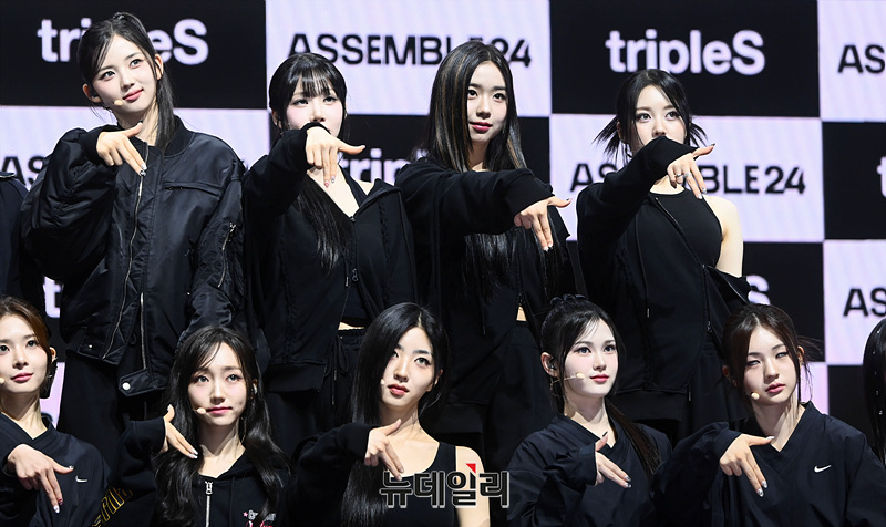 걸그룹 트리플에스(tripleS)가 8일 오후 서울 광진구 예스24라이브홀에서 열린 첫 번째 정규앨범 '어셈블24(ASSEMBLE24)' 발매 기념 쇼케이스에서 포즈를 취하고 있다.