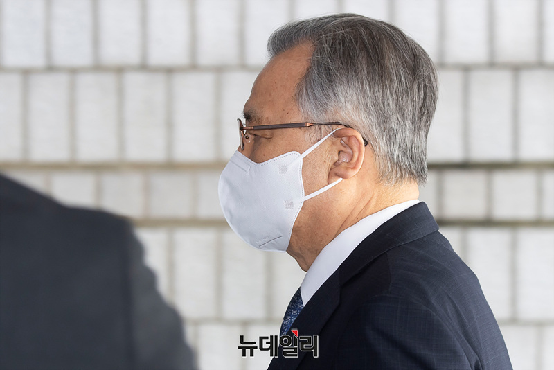 '대장동 50억 클럽' 의혹으로 기소된 박영수 전 특별검사가 9일 오전 서울 서초구 중앙지법에서 열린 '특정경제범죄가중처벌등에관한법률위반(수재 등) 등 혐의' 공판에 출석하고 있다.