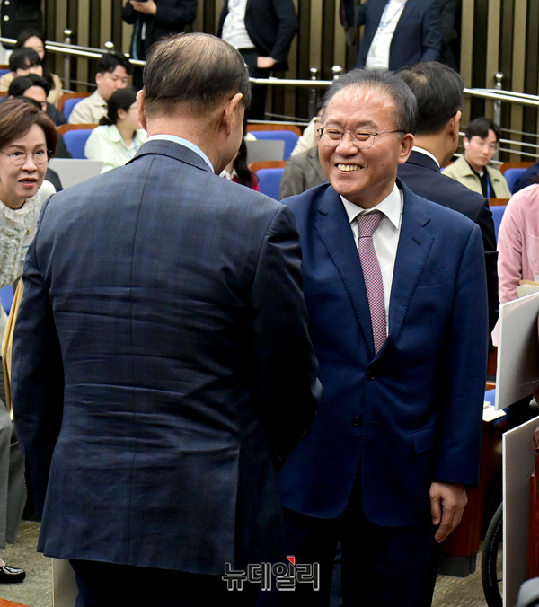 윤재옥 국민의힘 원내대표가 9일 국회에서 열린 2024 원내대표 선출 당선자총회에 참석해 황우여 비상대책위원장과 악수를 나누고 있다.