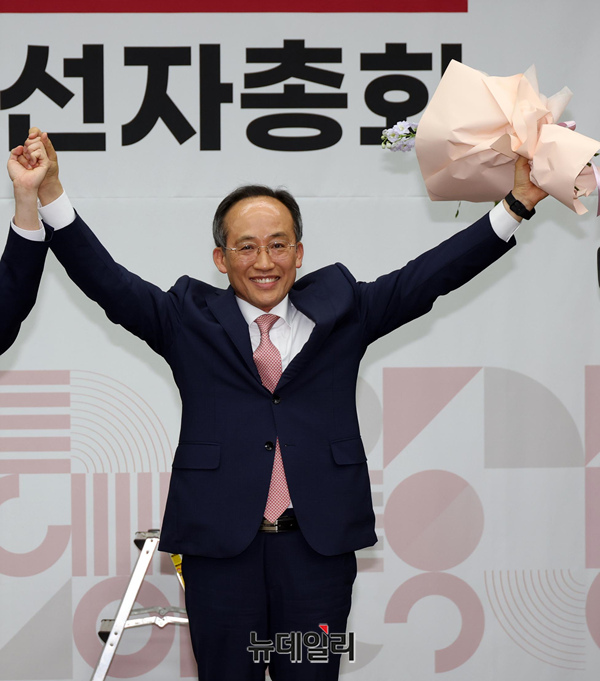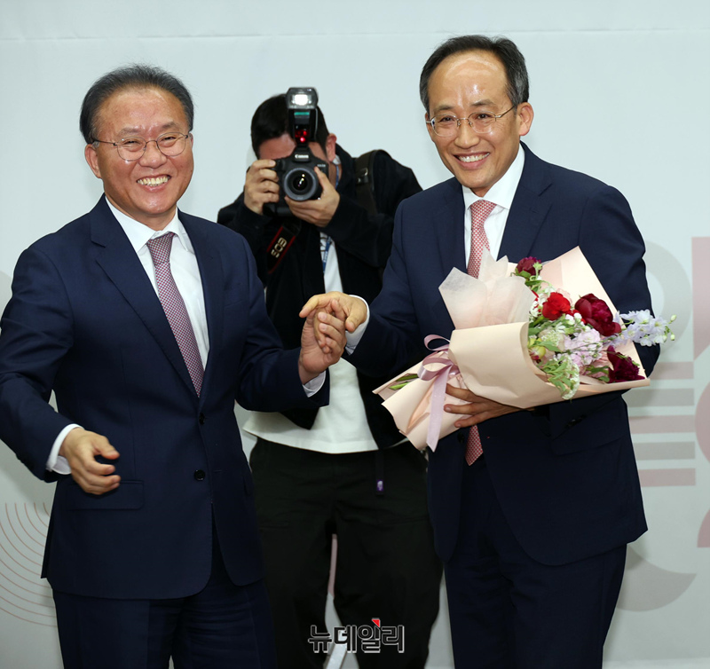 추경호 국민의힘 신임 원내대표가 9일 국회에서 열린 제22대 원내대표 선출 당선자총회에서 당선 확정 후 윤재옥 전 원내대표와 꽃다발을 들고 기념촬영을 하고 있다.